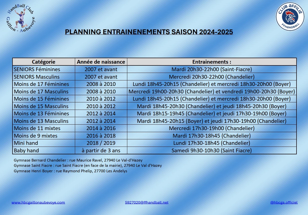Planning entrainements 2024-2025
